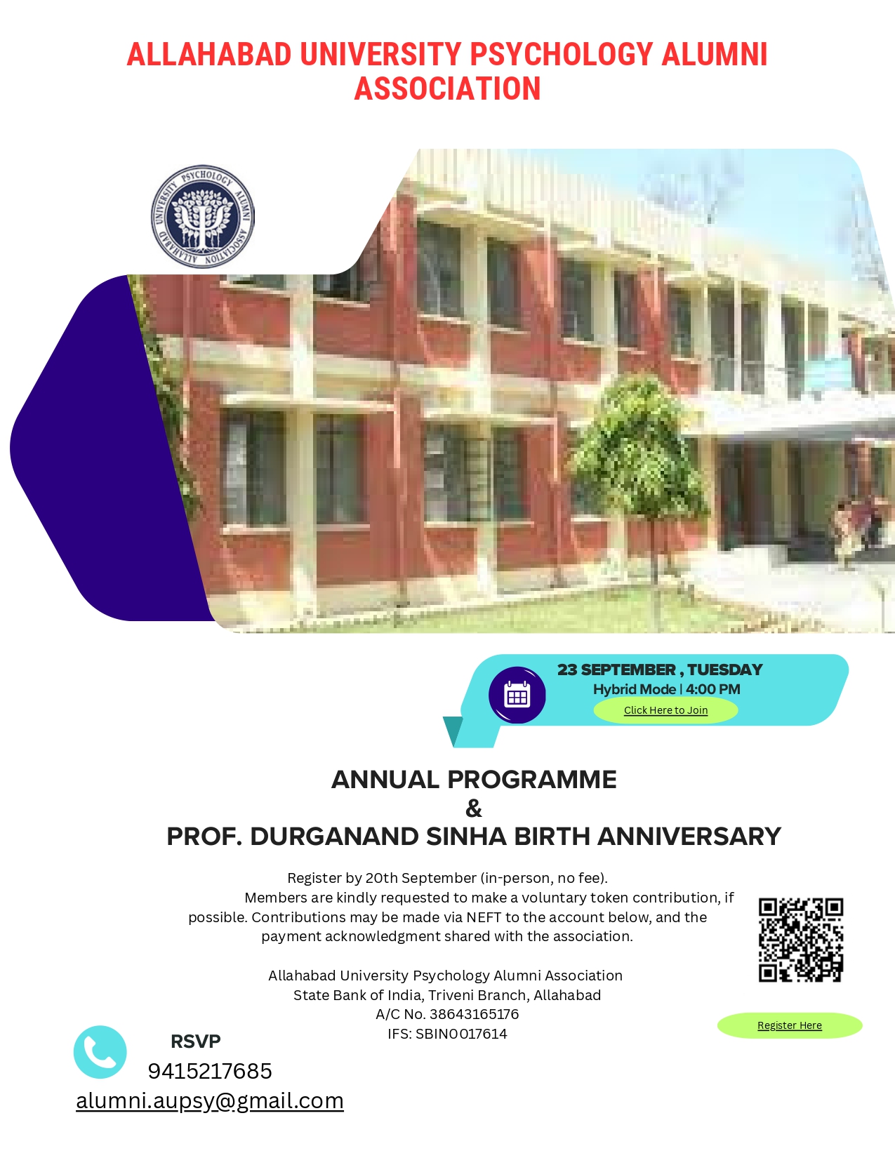 1 | Together for Legacy – Alumni Meet & Prof. Durganand Sinha’s 103rd Birth Celebration | 23/09/2025 | Annual Alumni Meet and Prof. Durganand Sinha’s 103rd Birthday Celebrations on 23rd September 2025 at 4:00 PM, at Town Hall, El Chico Restaurant, Civil Lines, Prayagraj, with hybrid participation available. Details are given in the brochure for those who wish to join online. | ![]() |